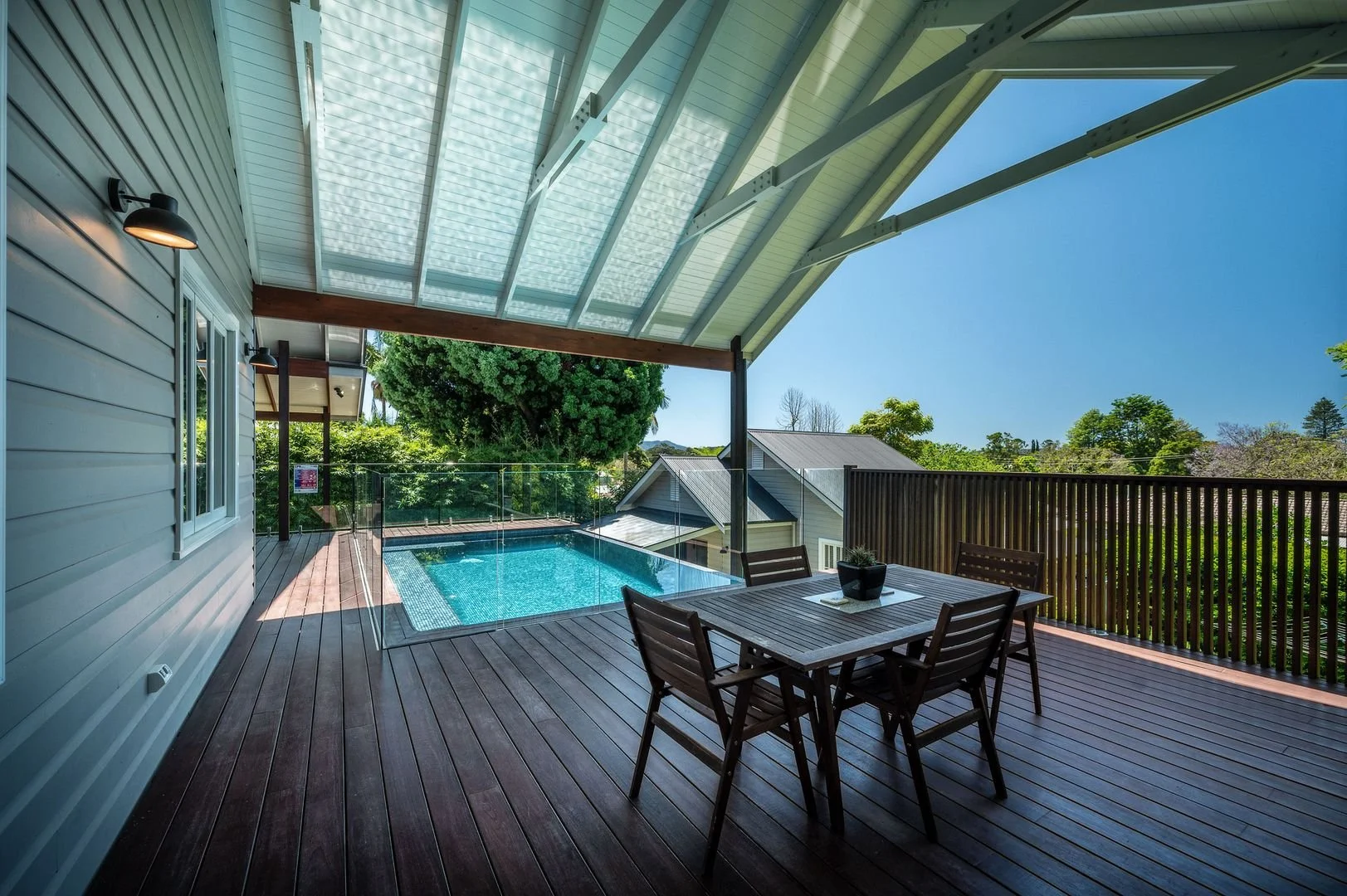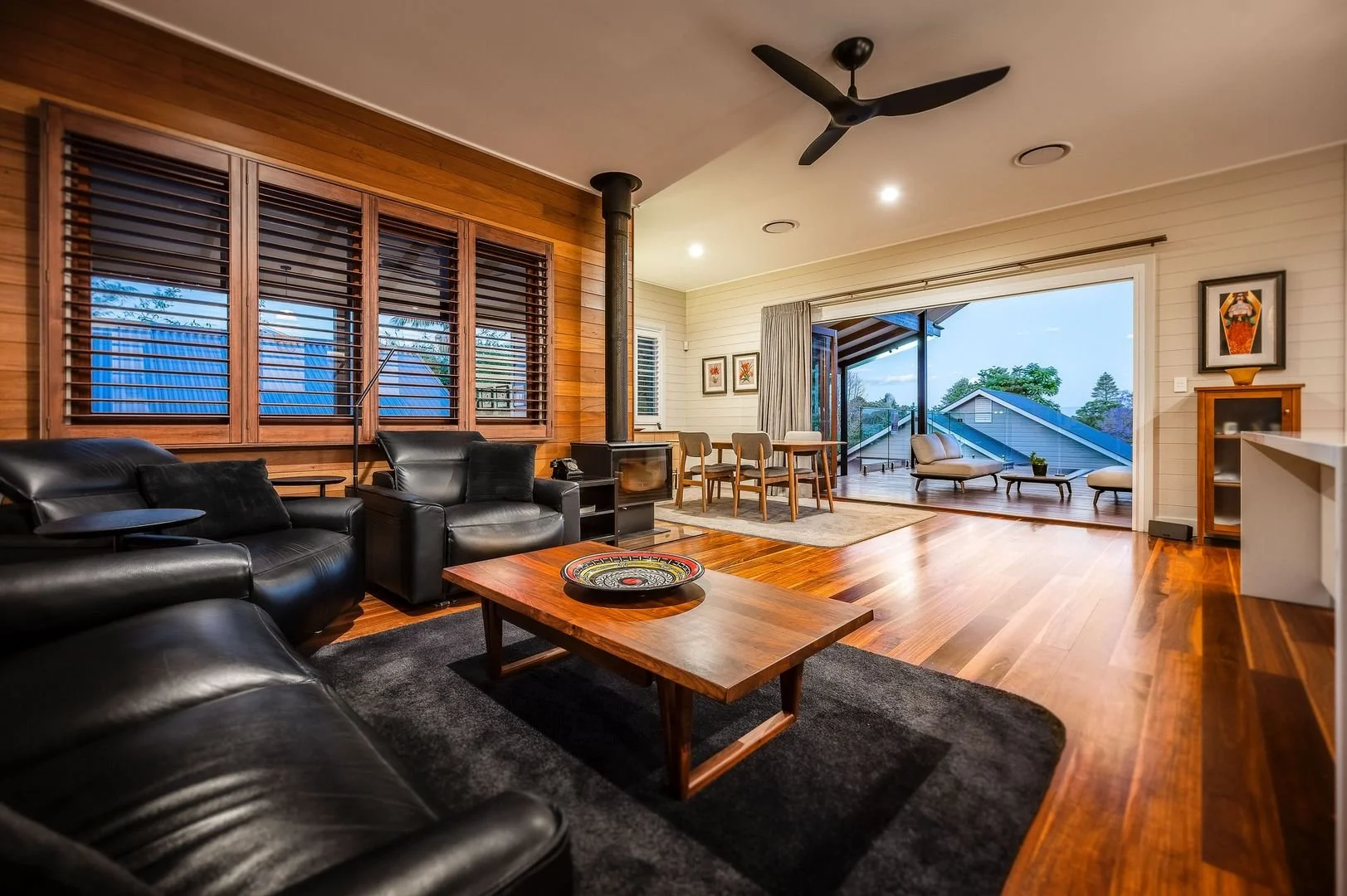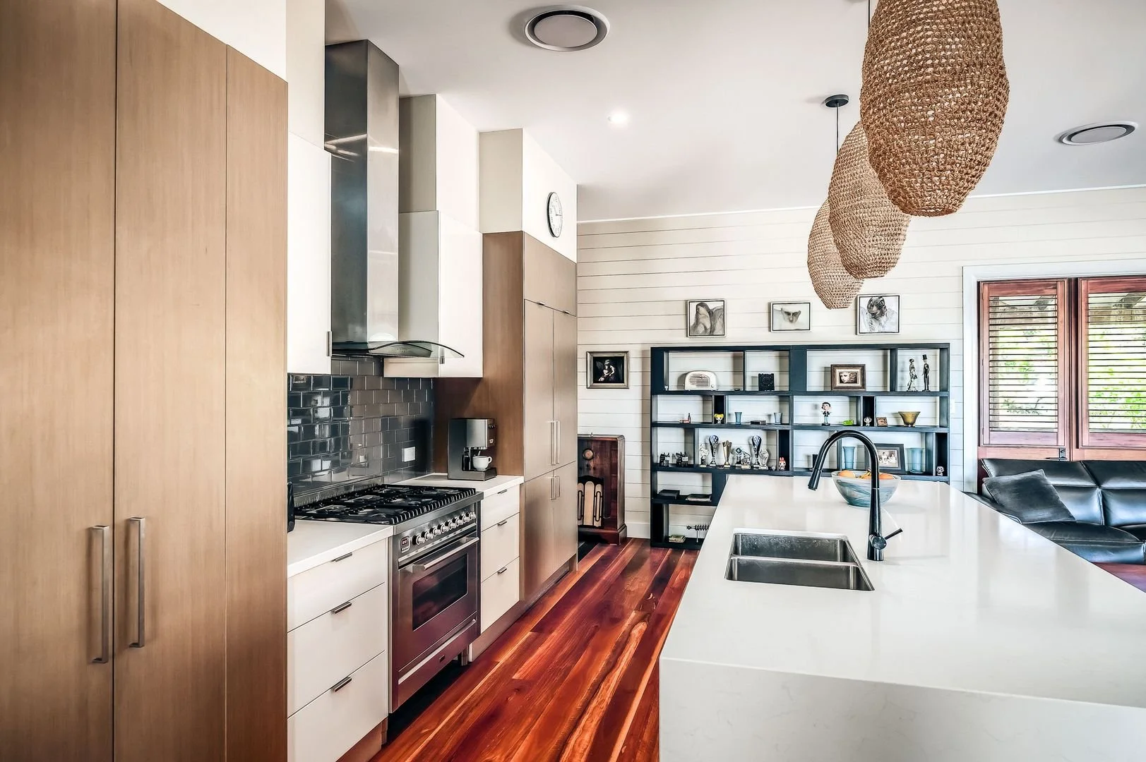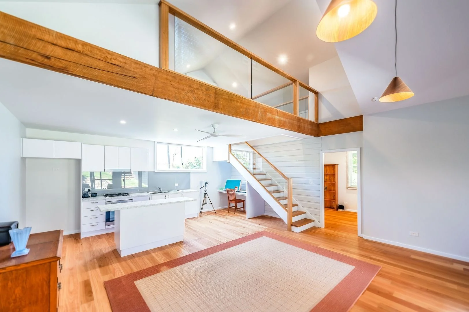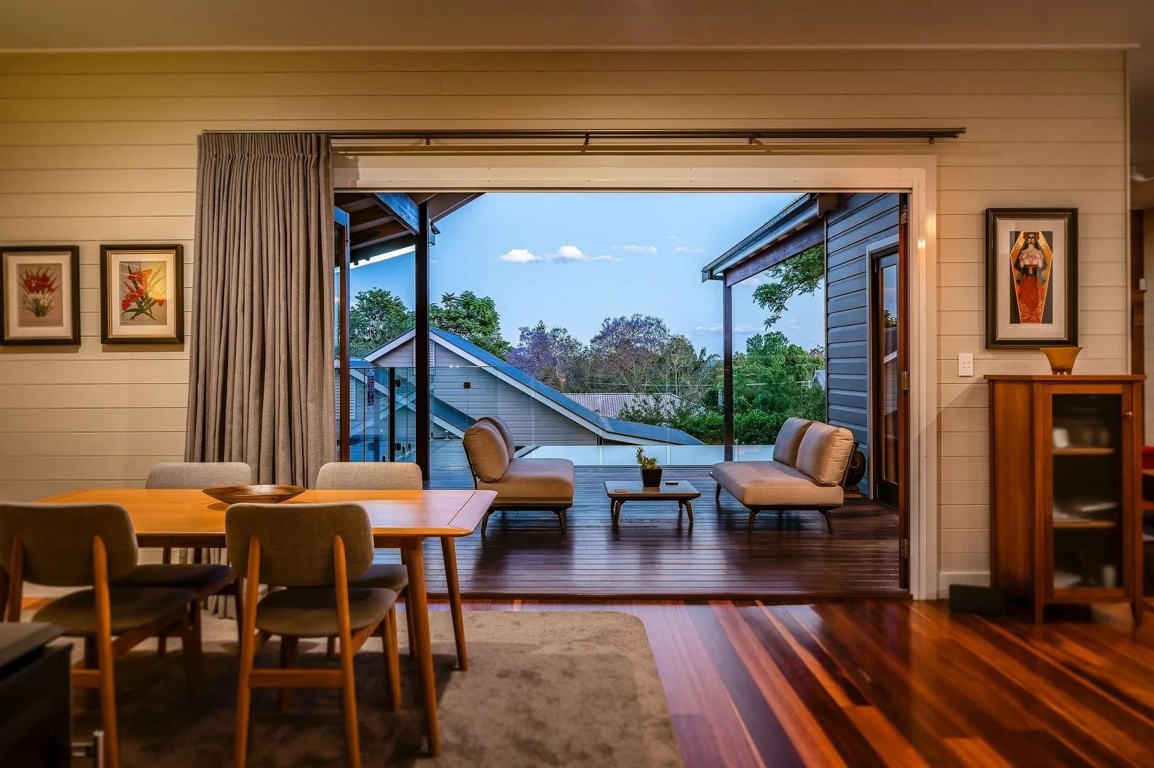 This extensivly renovated home shows traditional roof forms and verandahs, polished timber floorboards, high ceilings and open living spaces.