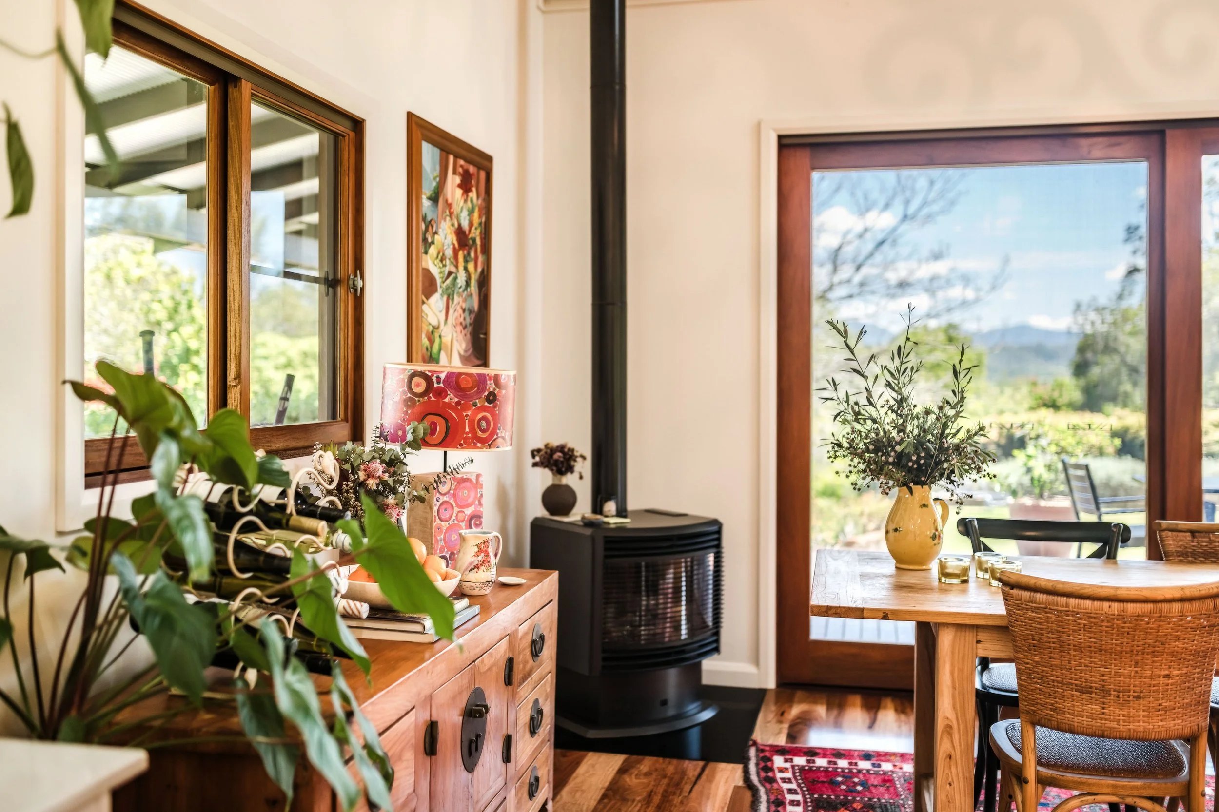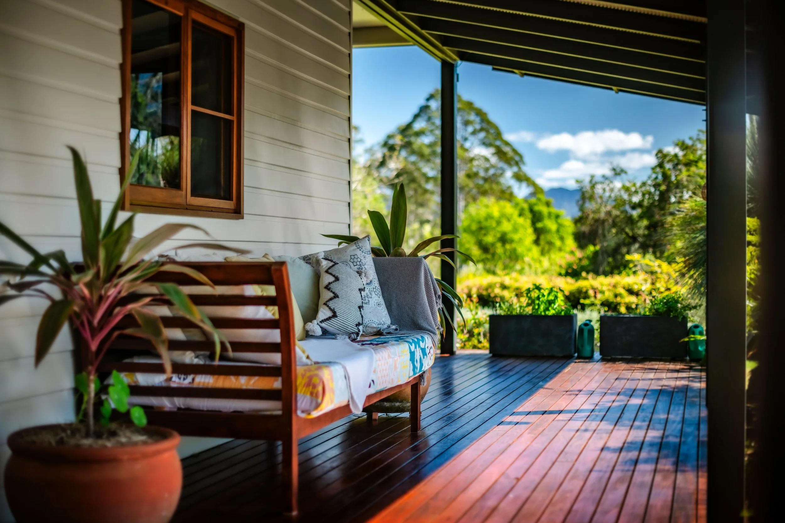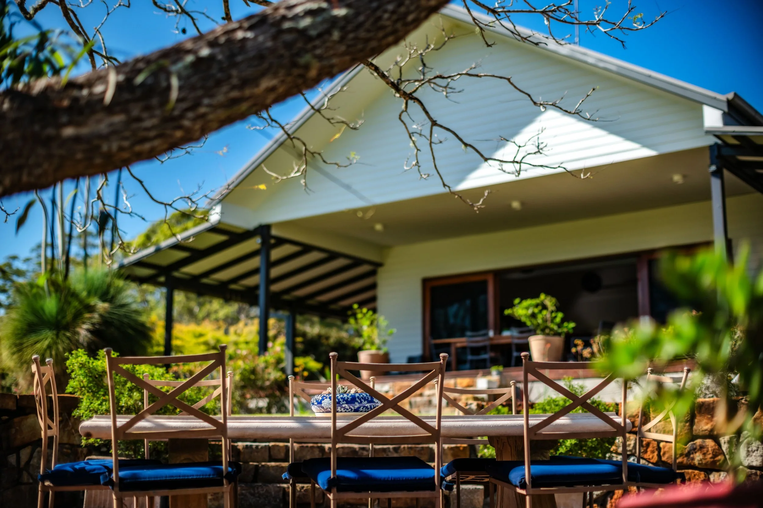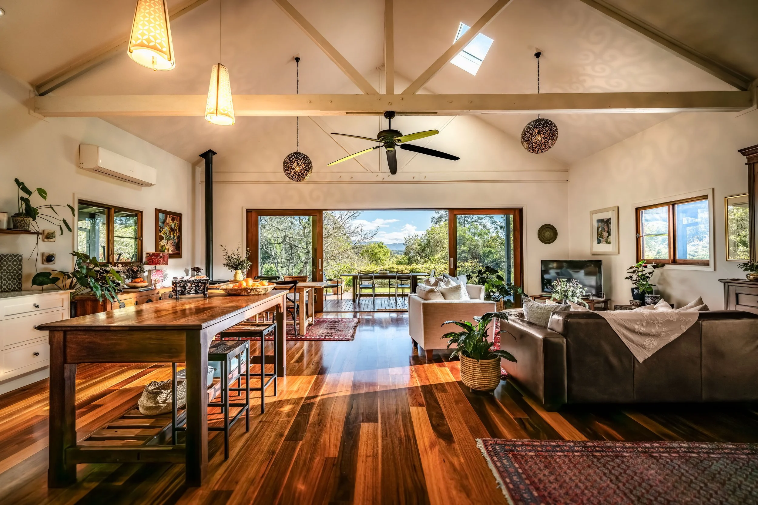 The challenge: An East West facing large dwelling plus shed. It was very dark inside and had no connection to the surrounding lands, but showed beautiful roof trusses. Extensive renovations were made to the internal living space which actually made it smaller after the completion of work. This was due to the removal of one bedroom and one bathroom on the northern end, turning the area into an outdoor deck which was the key to this successful renovation. Turning the shed into a secondary guest dwelling with an old concrete water tank transformed into a plunge pool was also a delight.